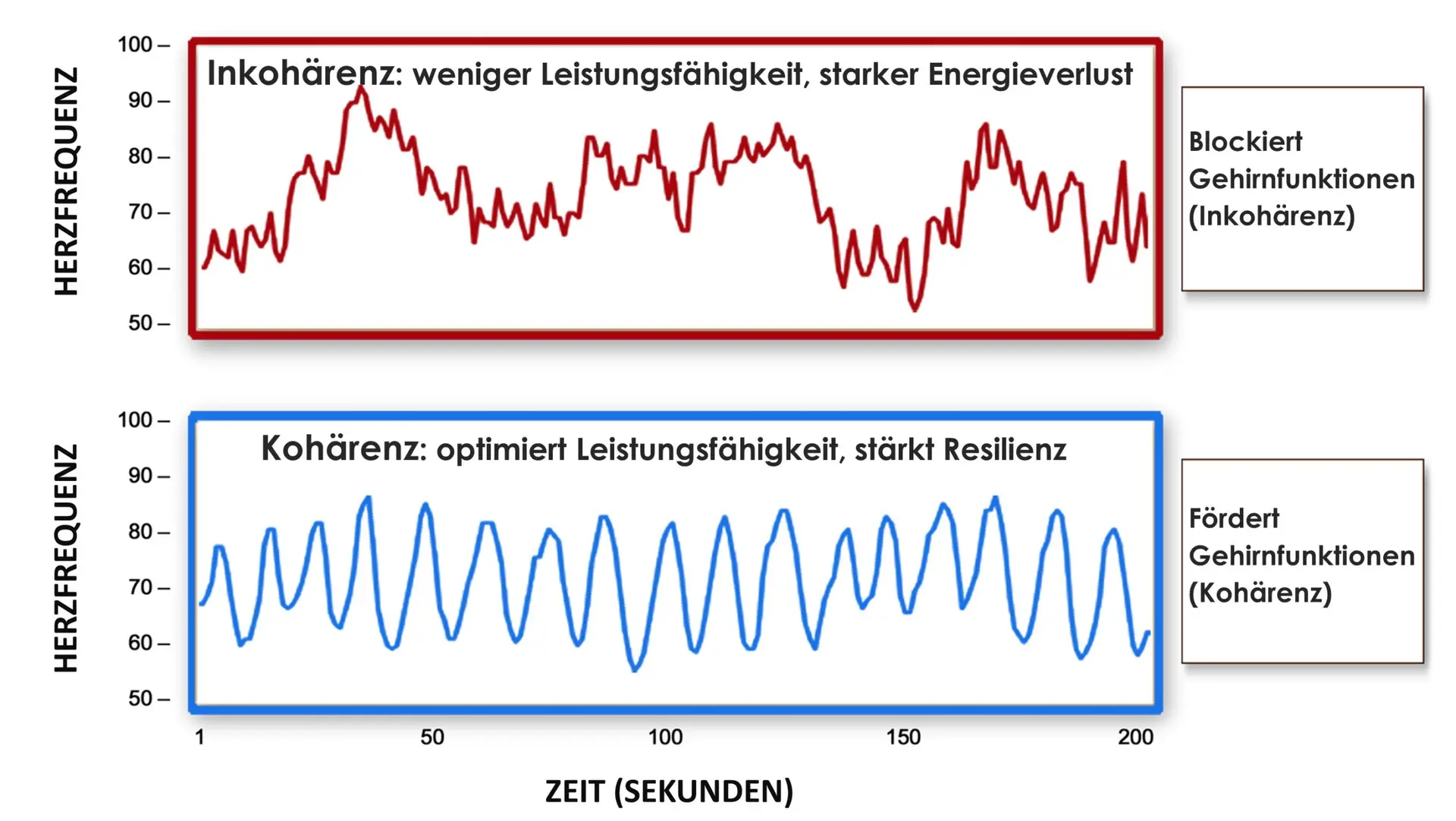 Diese Form der Atmung bringt das Herz in einen kohärenten Zustand, was bedeutet, dass Herz, Gehirn und Nervensystem im Einklang arbeiten – ein Zustand, der als optimal für körperliche und emotionale Gesundheit gilt.
